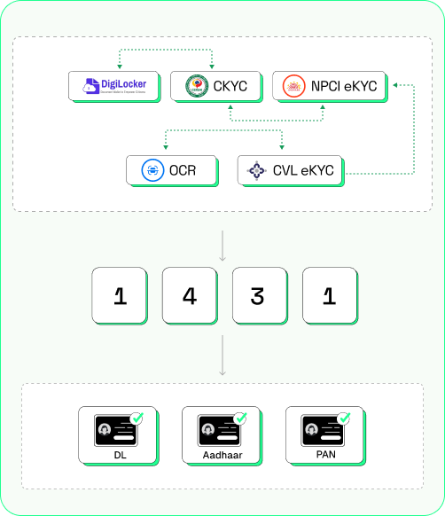 Power your onboarding with a unified stack that connects all verification rails: DigiLocker, CKYC, CVL eKYC Setu, NPCI eKYC Setu, & more.